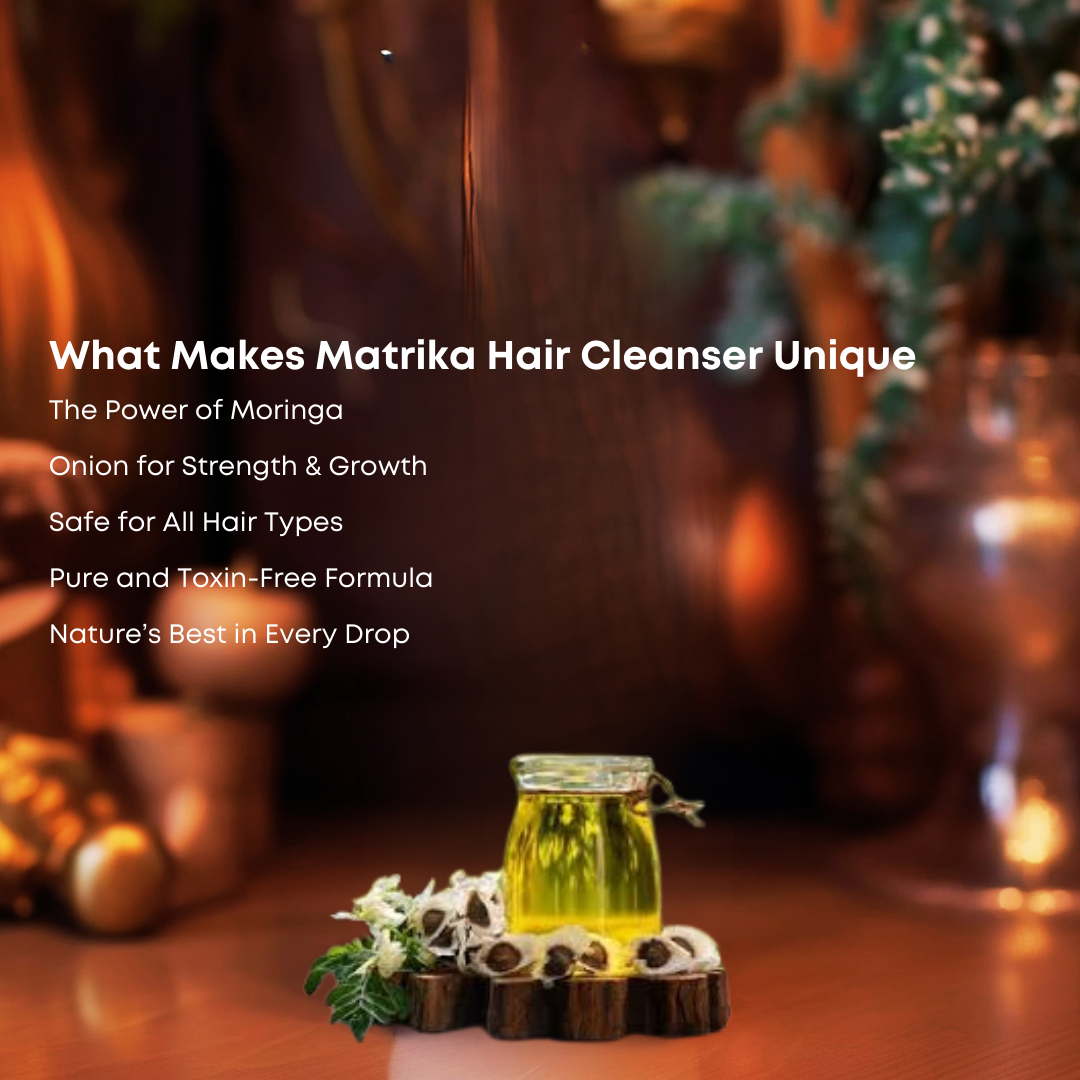 If you’re struggling with hair fall, frizz, or dull hair, your scalp might be missing natural nutrition. Matrika Hair Cleanser (Moringa & Onion) combines the nutrient-rich power of Moringa—often called the “Miracle Tree”—with Onion Seed Oil to stimulate growth, reduce fall, and strengthen strands. Enriched with Plant Keratin, Coconut Milk, and Vitamin E, this formula gently cleanses while restoring shine and smoothness. Unlike chemical shampoos, it’s 100% sulfate and paraben-free, making it safe even for colored or chemically treated hair. Switch today for naturally stronger, softer, and healthier hair.